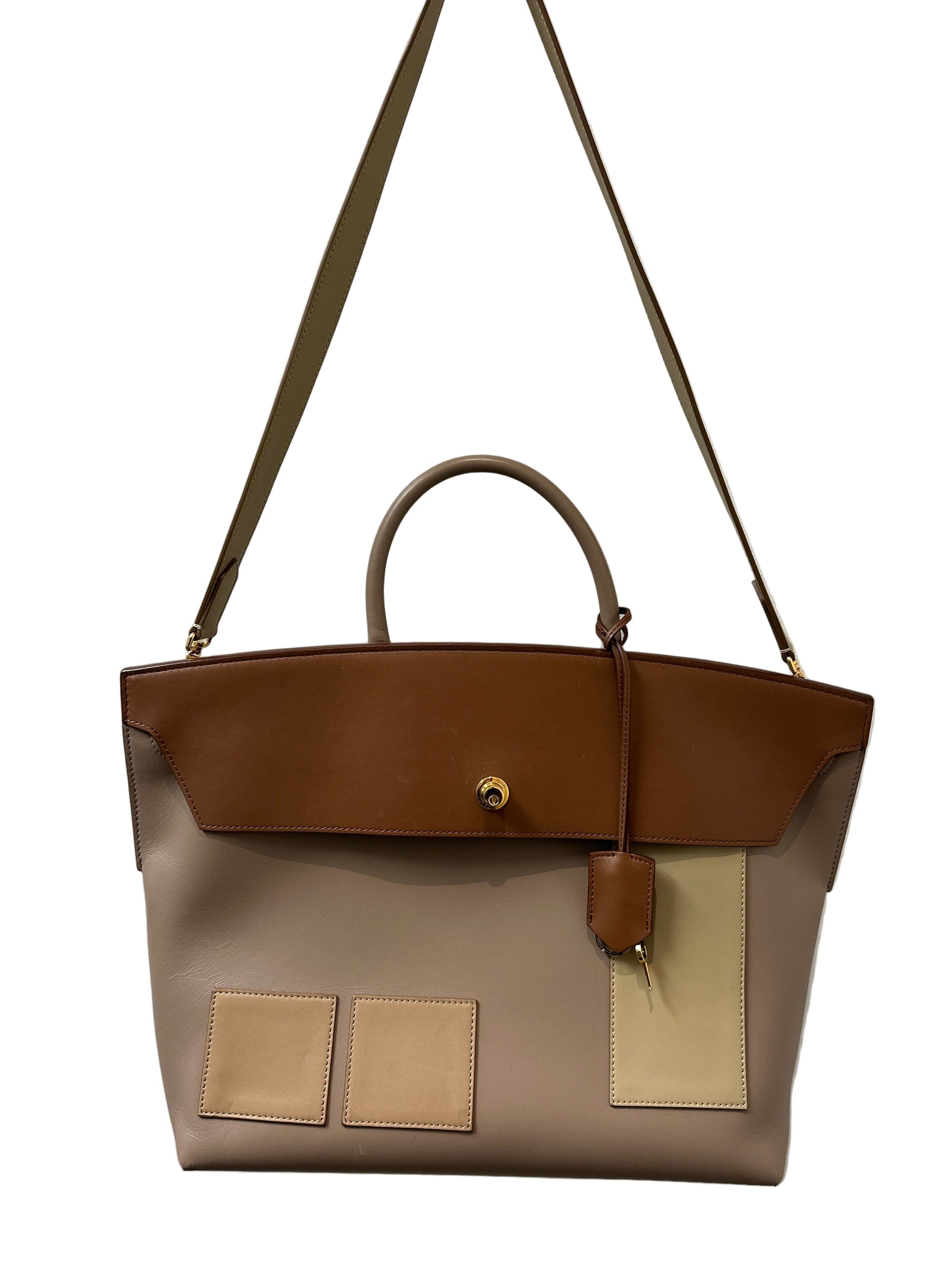 Burberry Calfskin Society Top Handle Bag in Brown. Beige rolled leather top handle and optional leather shoulder strap. Brown suede interior with patch pockets.