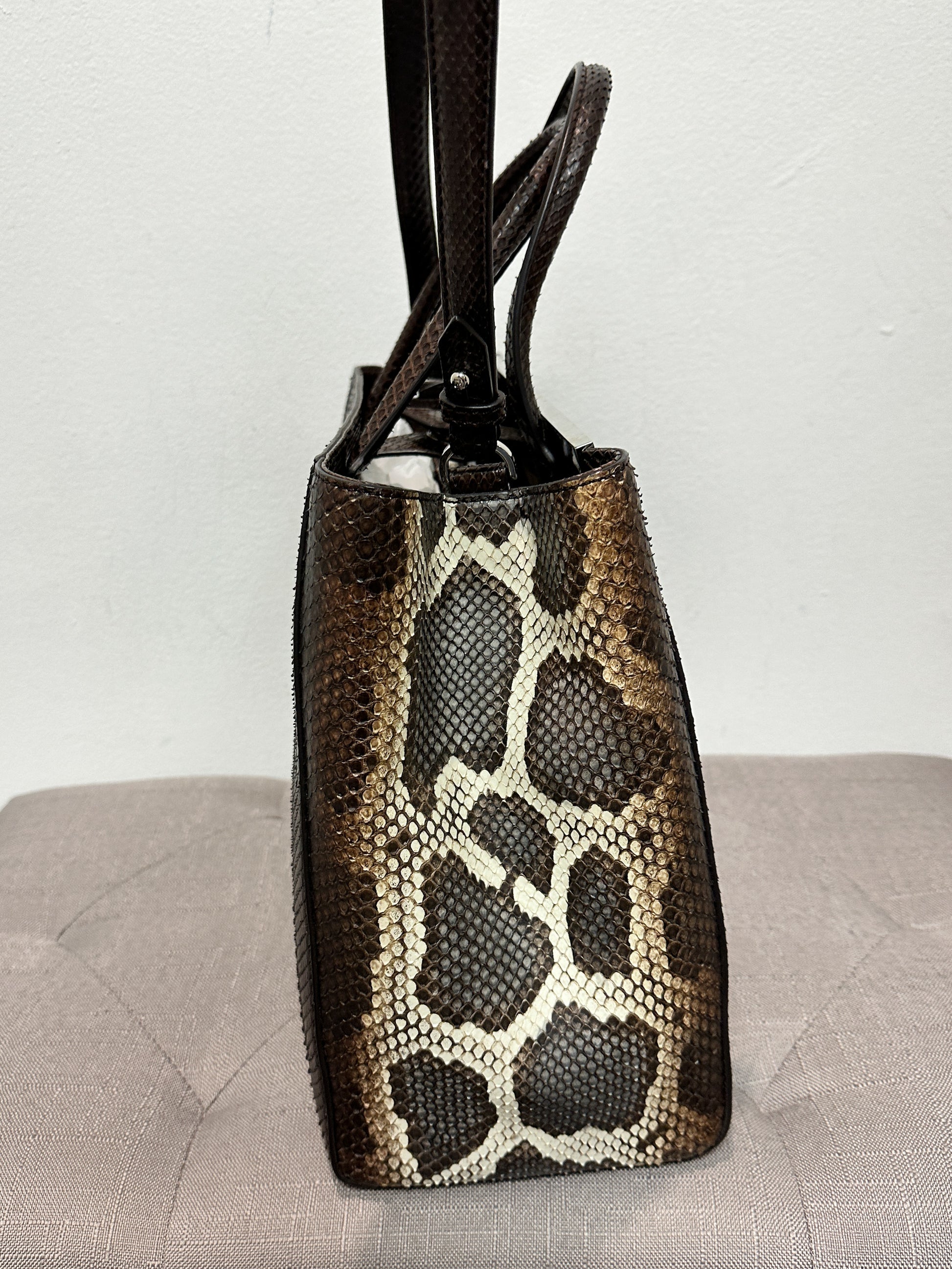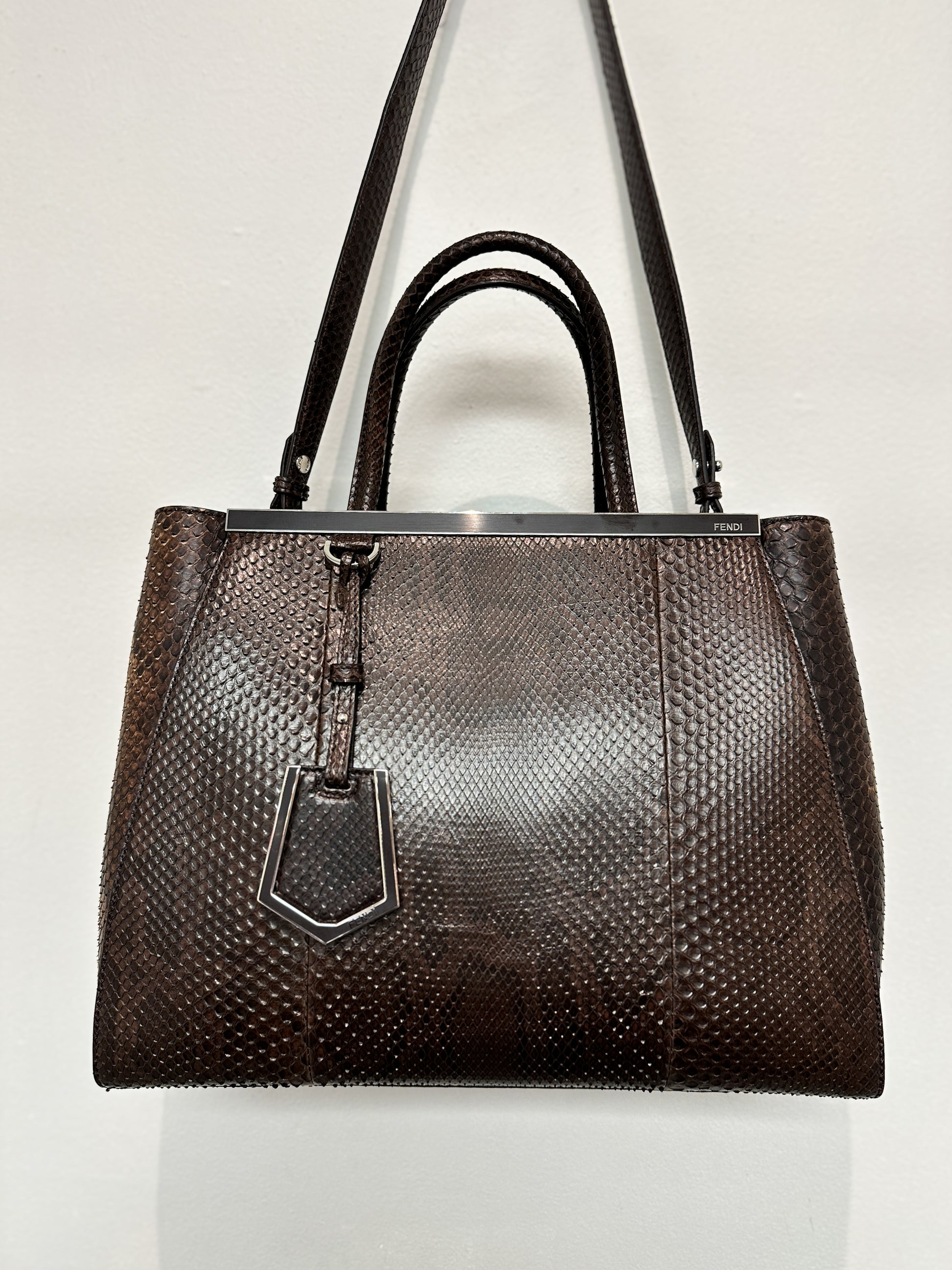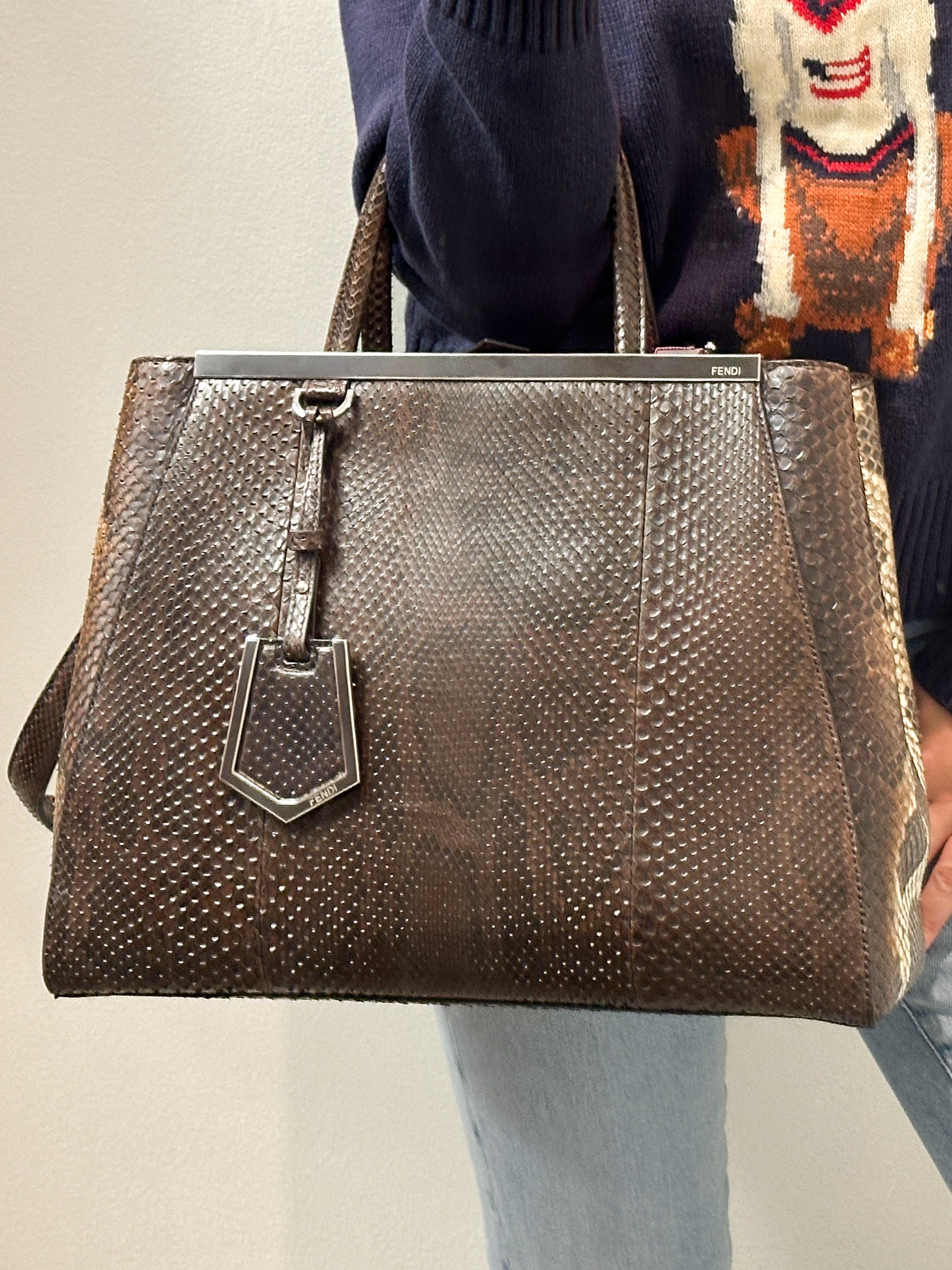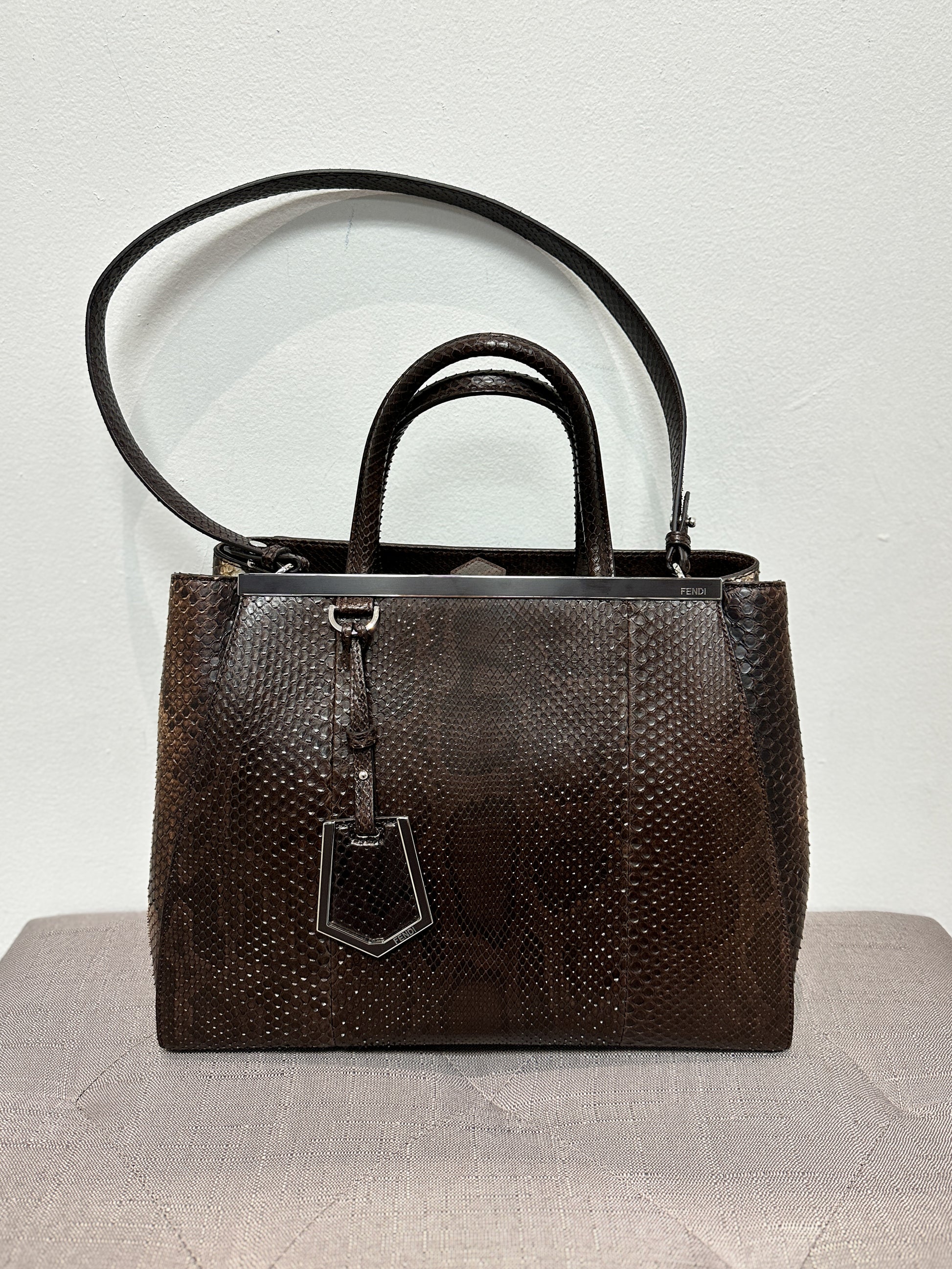 Fendi 2JOURS Tote in brown python with white/gray accents. Dark brown handles, matching strap, silver top bar. Snap closure with divided interior and center zip pocket.