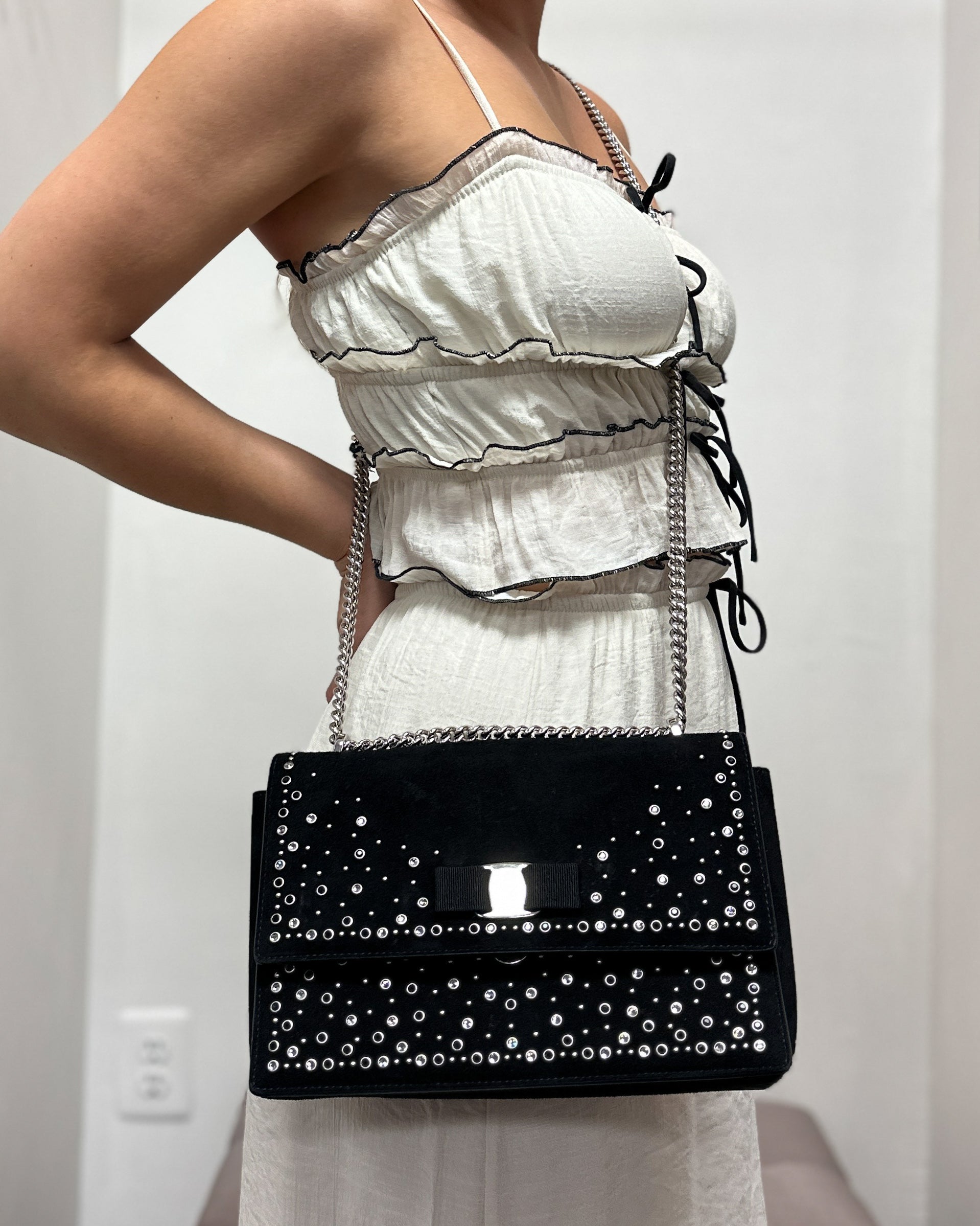 Embellished Salvatore Ferragamo Suede Black Chain-link crossbody shoulder strap bag. Flat bottom provides upright structure. Leather lined interior features a back-wall zip pocket.