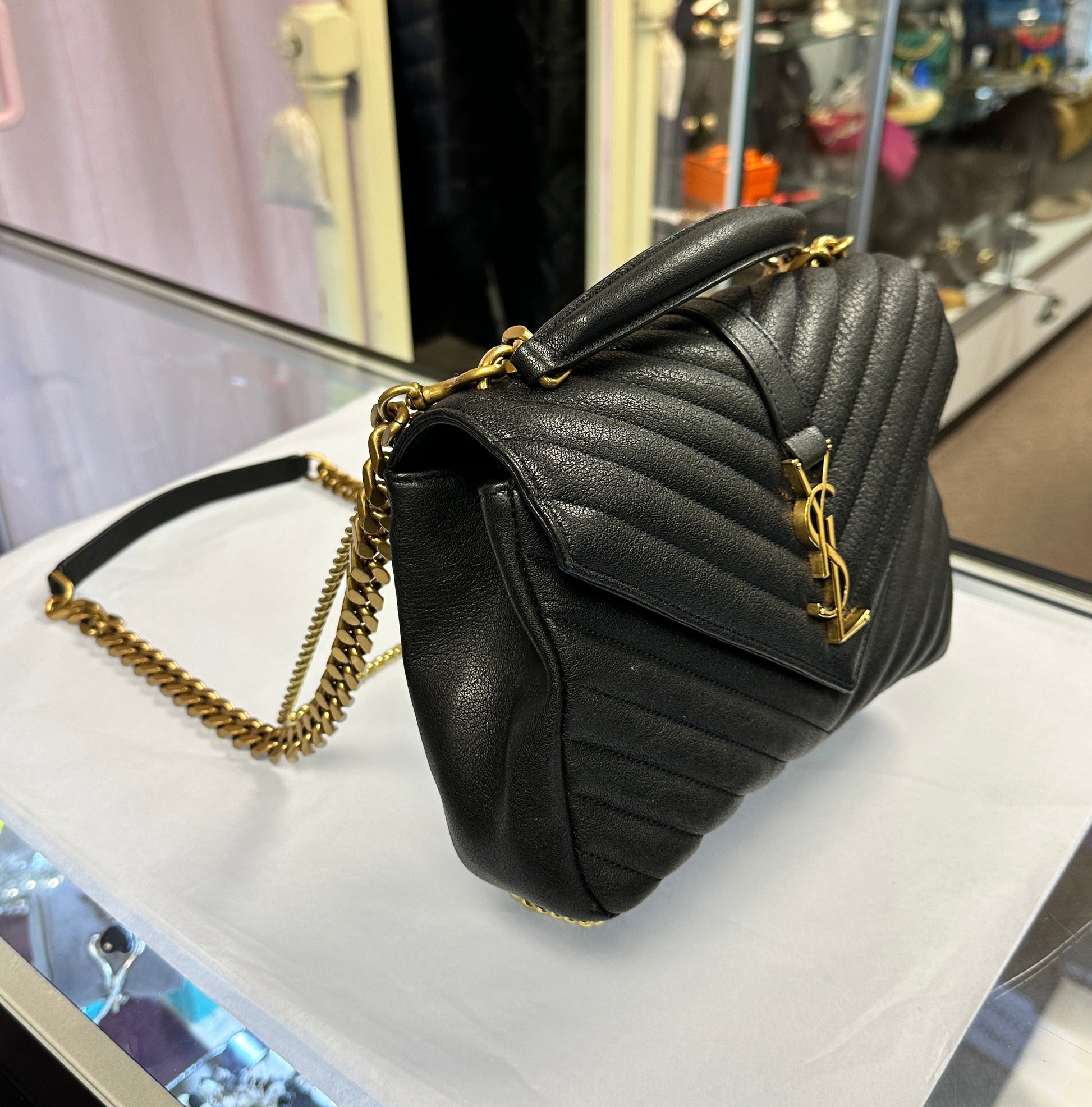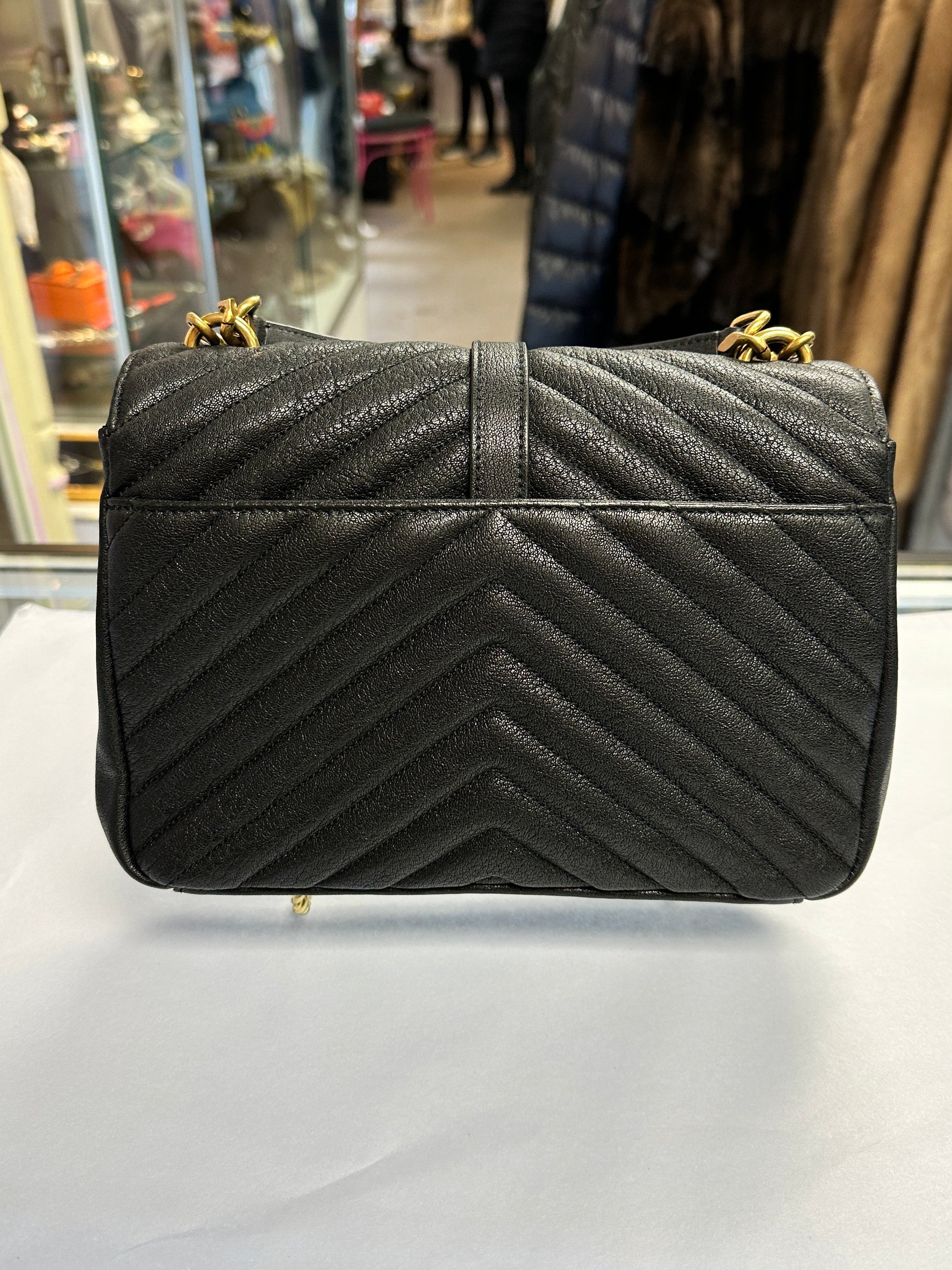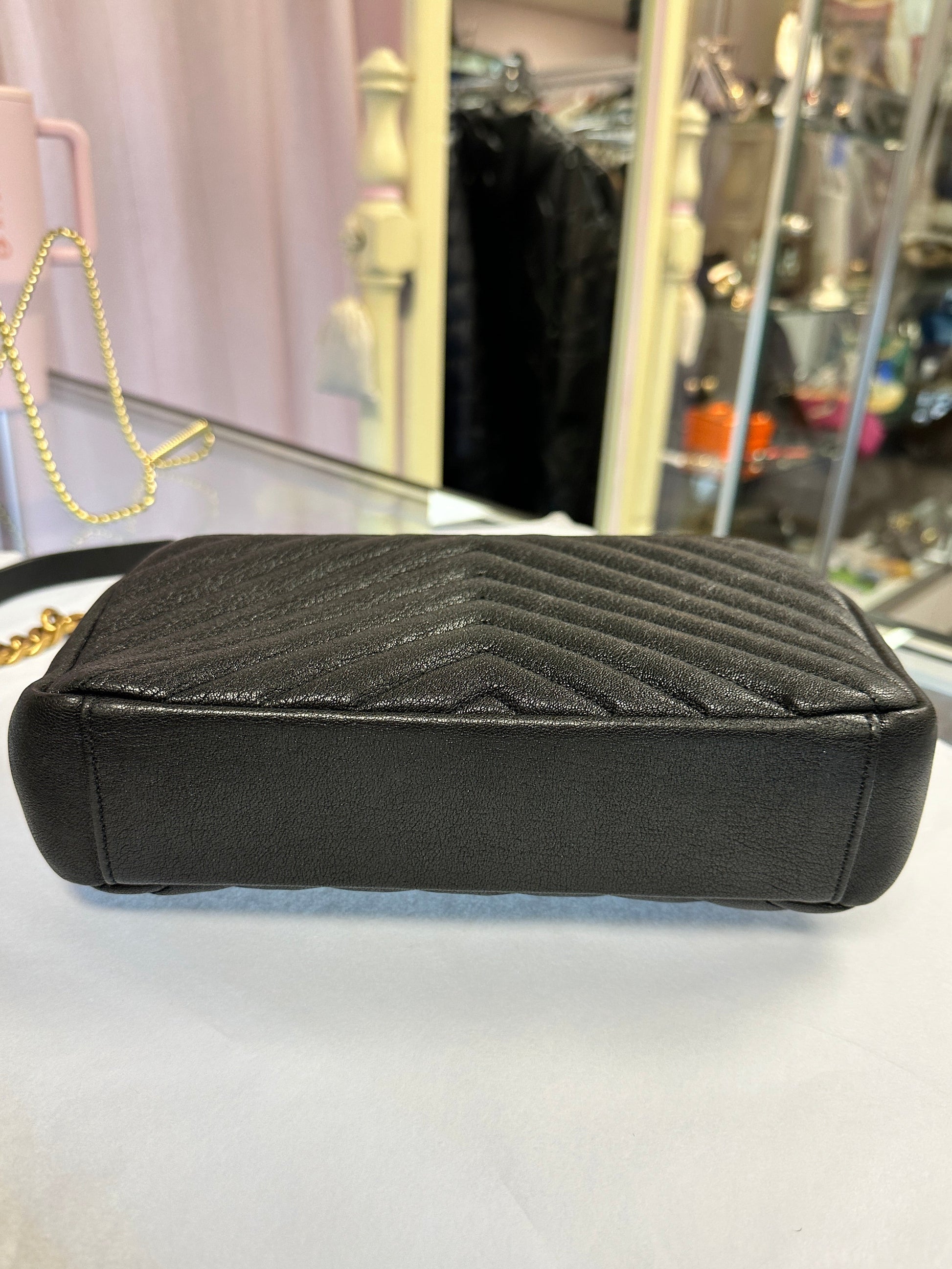 Hardware: The bag has a gold-tone metal YSL monogram (Cassandre logo) closure on the front flap.