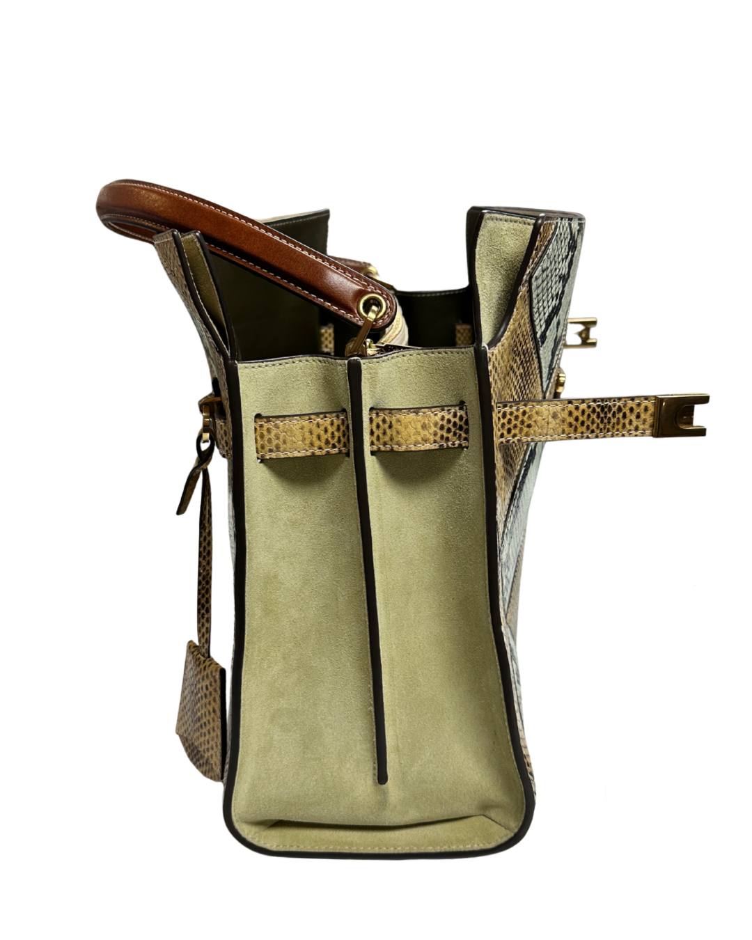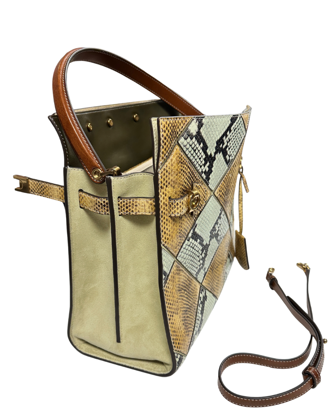 Tory Burch Lee Radziwill Double Tote Bag crafted from beige leather and cotton. It features an animal print diamond pattern, gold-tone hardware, a single top handle, a partitioned compartment, and an adjustable strap. It can be worn on the shoulder or carried in hand.