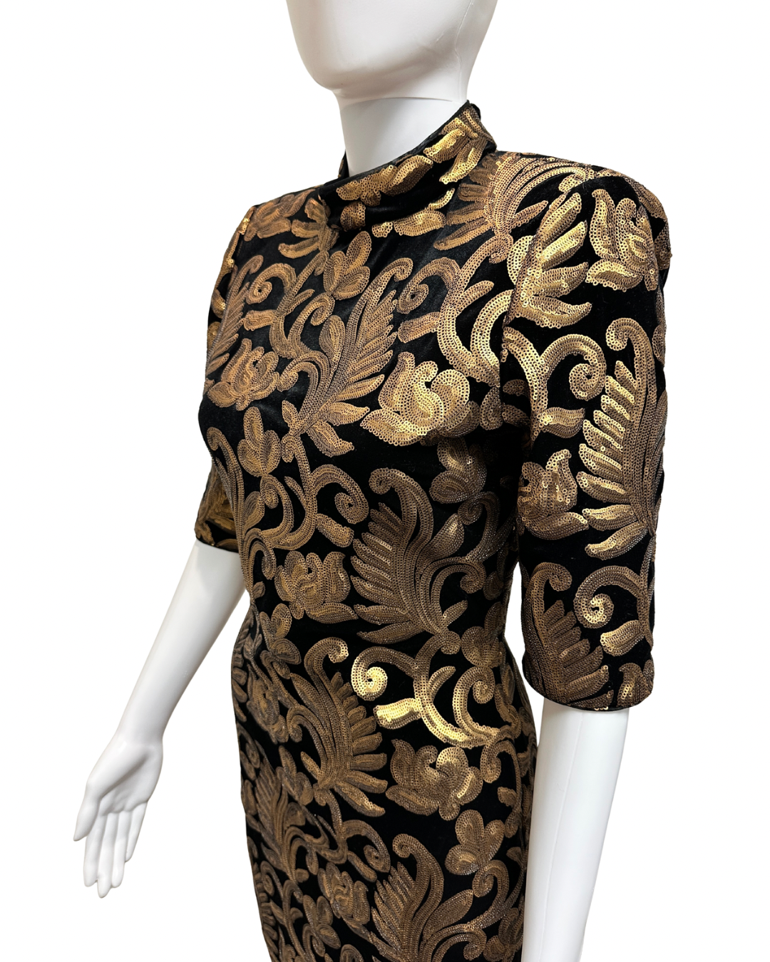 Alice + Olivia Inka Strong-Shoulder Mockneck Dress in black with gold sequin embellishments. Size 8.