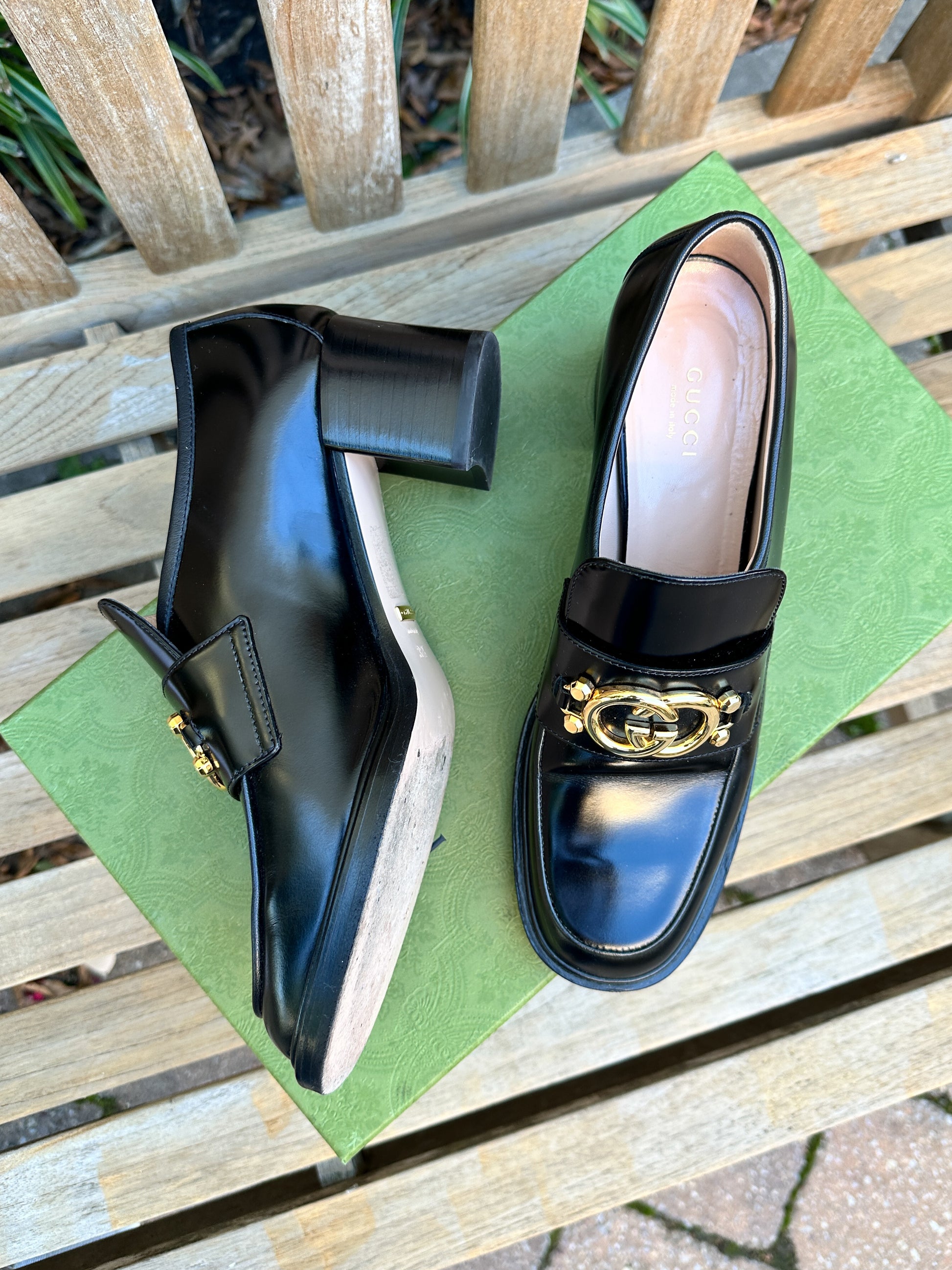 Gucci Interlocking G gold tone black leather loafer pumps with block heel. Size 38.5